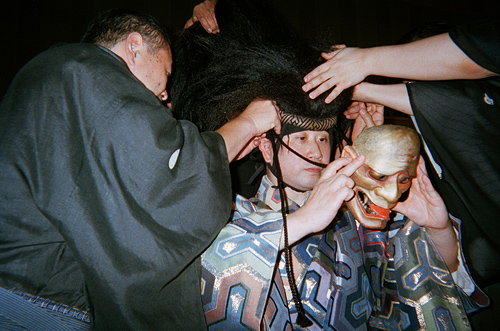 - ぼくは、おぶ台に出ているお父さんが、かっこいいなと思うのですが、面をつけてしまうと、だれなのか分からなくなるので、つける直前にしました。 ふだんは、あまりうろうろしてはいけないしゅん間なので、ぼくも写真をとるのに、きんちょうしました。