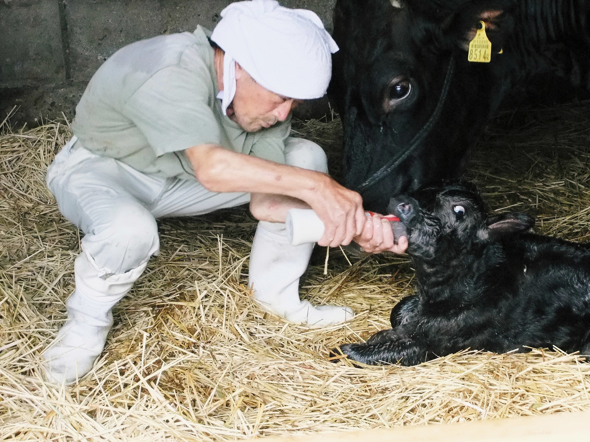 - おじいちゃんはリュウマチという病気で、手足の関節が変形しています。だから手を使う作業は大変だし、足は少し引きずって歩きます。そんなおじいちゃんが、子どもを守ろうと親牛がじゃまをする中、生まれたばかりの子牛に初にゅうを飲ませようとがんばっているすがたがすごいなぁと思い写真をとりました。