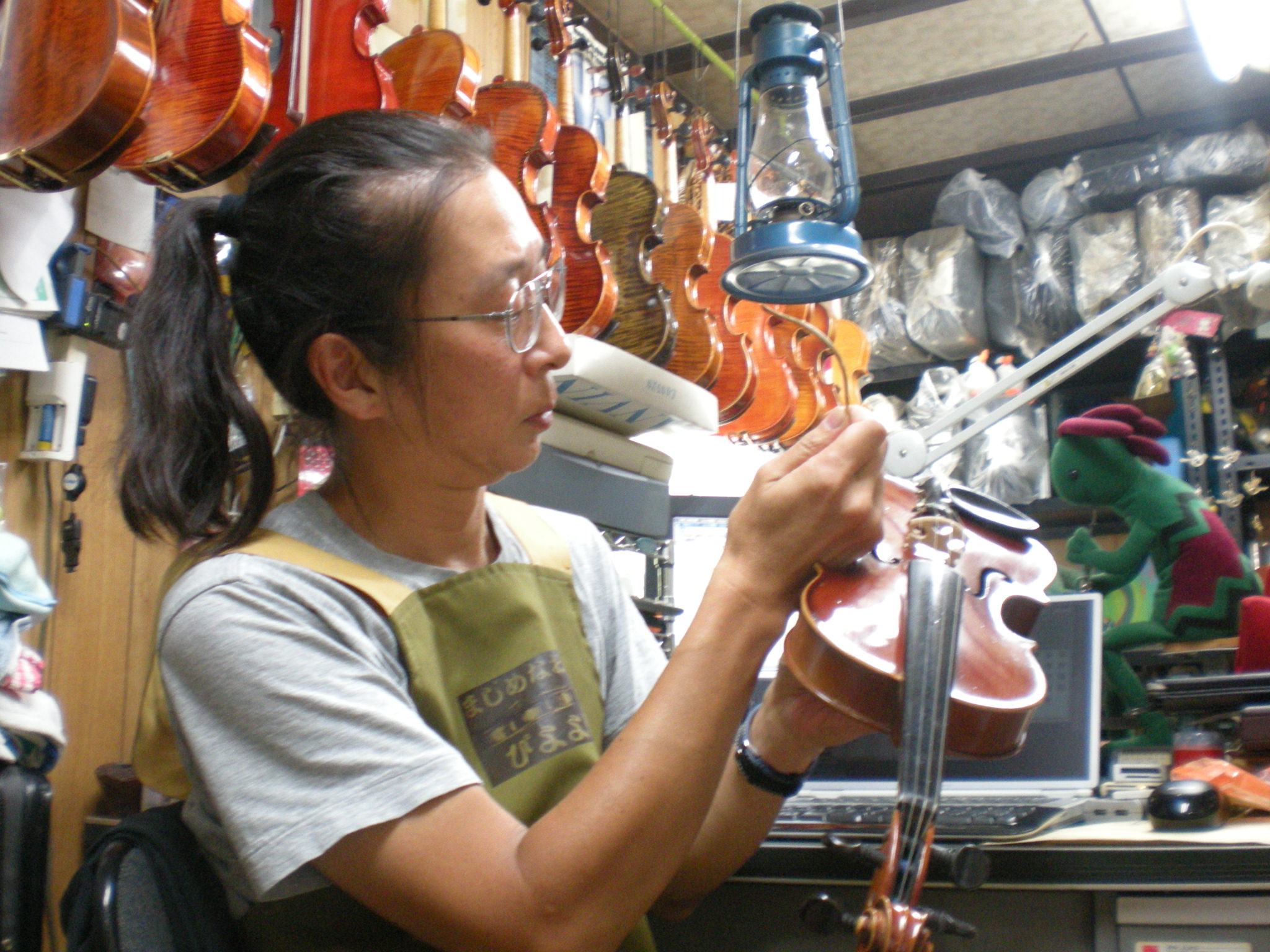 - これは、父がバイオリンのこんちゅうをたてているところです。こんちゅうというのは、虫ではなく、バイオリンの中にある、いちばんだいじなぶひんで、いい音がひびくかどうかのしょうぶです。いつもはおもしろい父のかおが、このときだけはだいじなところなので、すごくしんけんでこわいかおにかわります。そこをとりたかったのです。