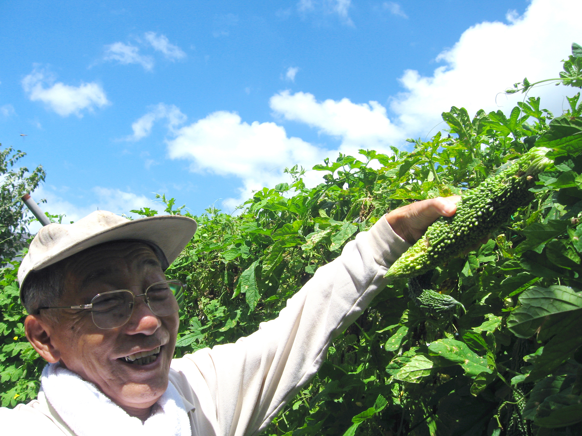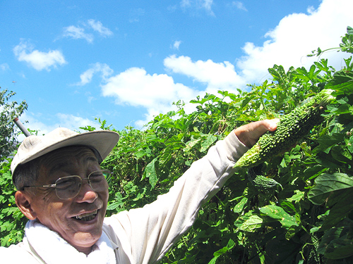 - 私の祖父は、畑でたくさんの種類の野菜を作っています。いつも採れたての新鮮な野菜を家に持ってきてくれます。その祖父が、夏休みに、「一緒に畑に行かんか」と誘ってくれました。畑での祖父の様子は、いつも以上に生き生きとして楽しそうでした。特に、立派に育ったゴーヤを収穫するときの表情は、とても嬉しそうでした。そんな祖父の満足した表情を撮った一枚です。