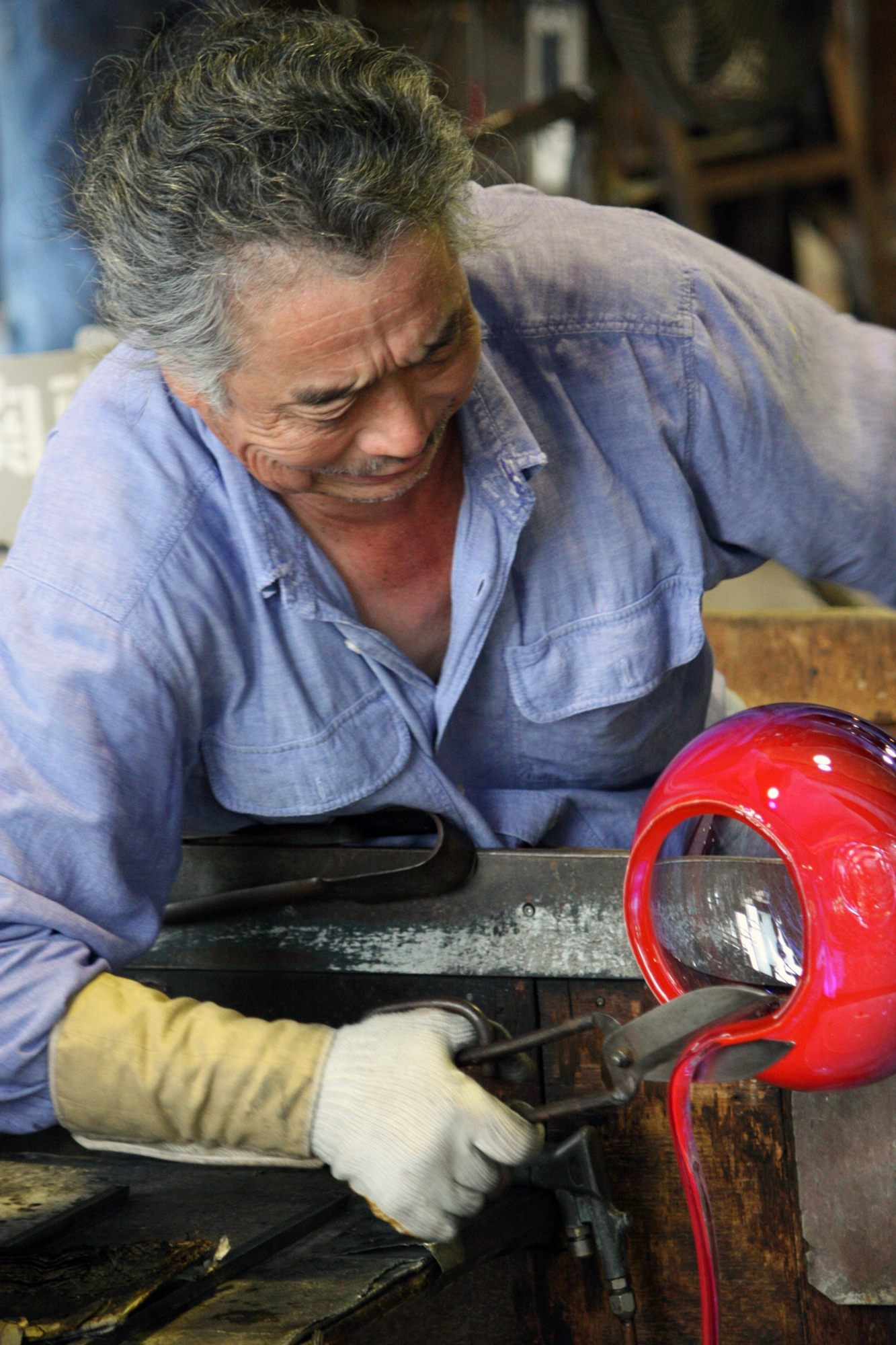 そこで職人さんがガラス作りをしているのを見学させてもらった時、私は職人さんの鮮やかな手付きを見てどうしても撮影したくなり撮らせてもらいました。