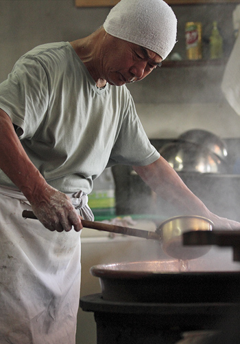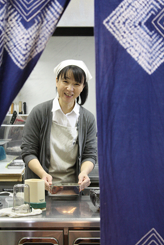 旦那さんが蕎麦打ちをしている間、厨房で一品料理を作っている奥さんを、のれん越しに撮影しました。
