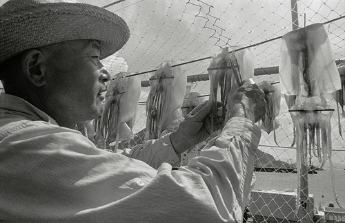 - 目の前には海が太陽光を反射してキラキラと輝いていました。そんな素敵な場所で麦わら帽子をかぶってイカを干している漁師さんを撮影させていただきました。干されたイカは透けてゆらゆらと風に揺れていました。とても暑い日でしたが、一つ一つ丁寧にイカを干す漁師さんに魅力を感じました。