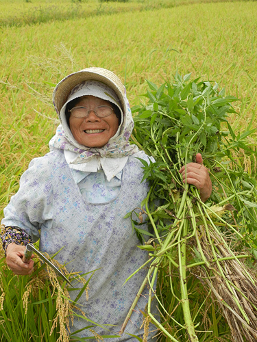 - 秋の収穫の写真を撮ろうと田んぼを歩いていたら仕事仲間と楽しそうに話しながら草刈をしているおばあさんがいた。