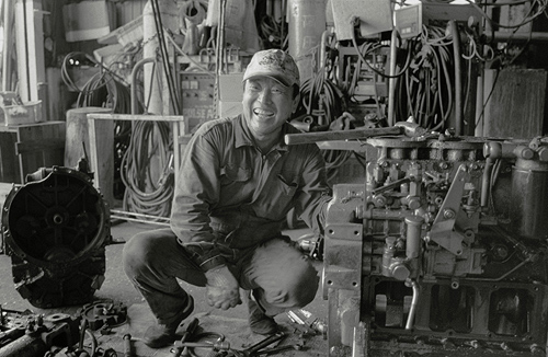 - この写真は、兵庫県姫路市にある坊勢島へ行った時に撮影しました。坊勢島は小さくて人も少ないけど、温かくて明るくて島らしさに溢れていました。その島で船のエンジンを扱う仕事をしているおじさんに出逢いました。海の見える工場で一生懸命働きながら話してくれるおじさんを見ていて、島男だなぁと感じ、撮影しました。