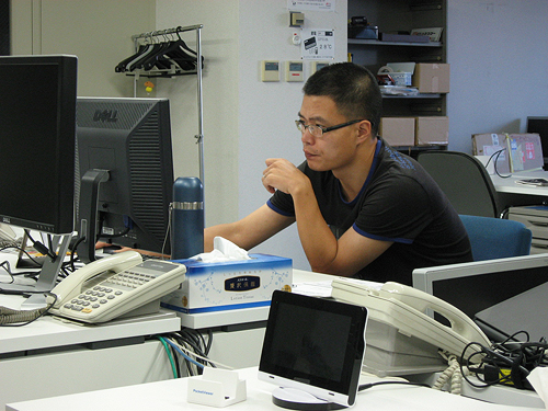- お父さんが、会社でどんな仕事をしているのかと思い、お父さんの会社に行ってみました。たくさんのパソコンにかこまれて、仕事をしていた事にとてもおどろきました。その中で、程さんという人が一生けん命プログラミングの仕事をしていたので、写真をとってみました。程さんに気付かれないで、写真がとれてよかったです。