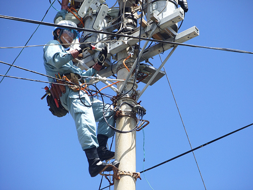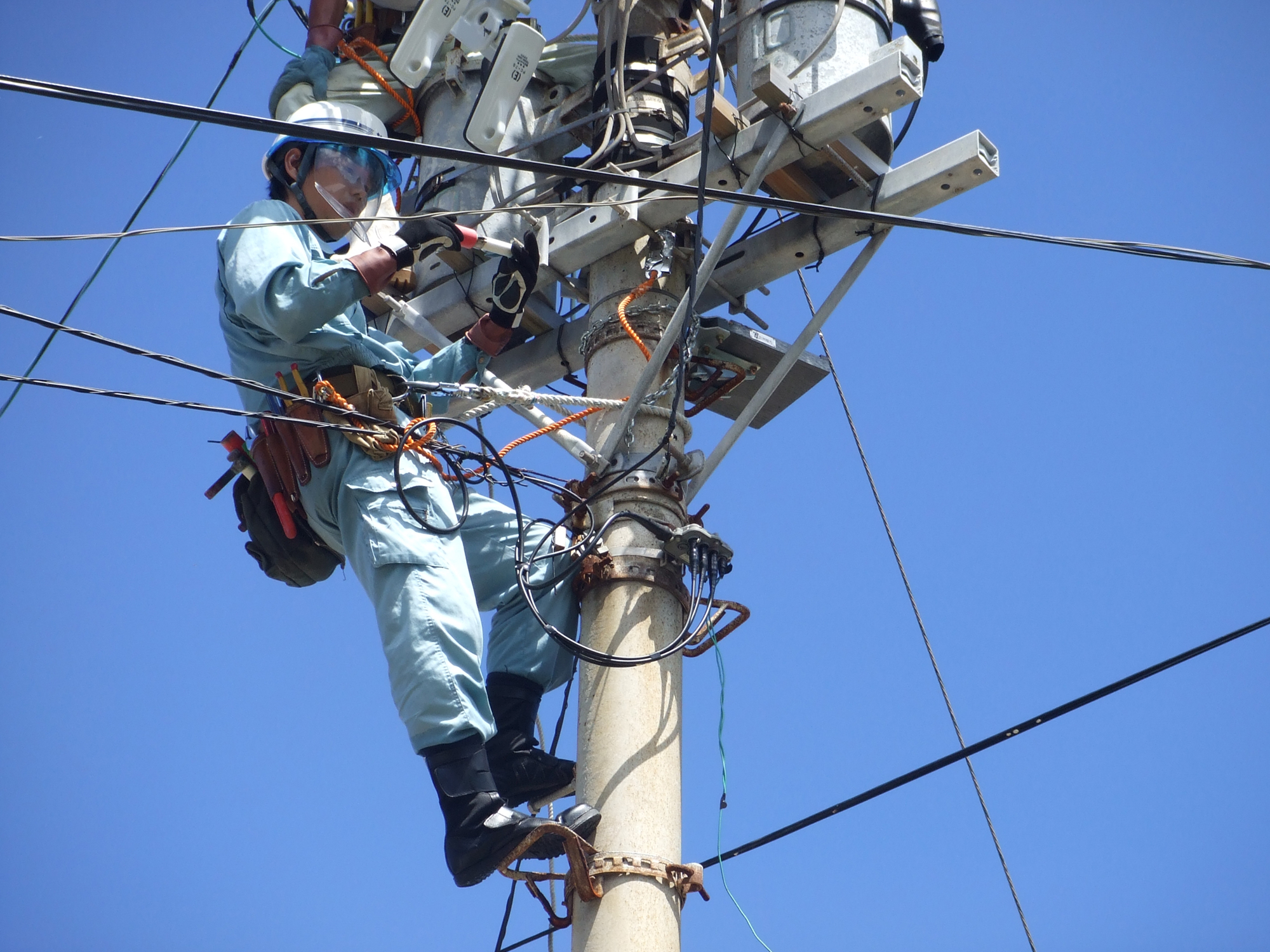 - ぼくのお父さんは、小宝島の発電所ではたらいています。写真は、てい電を直しているところです。電話があって、すぐに出かけていきました。あついなかたいへんだなあ、屋根より高い電柱にのぼってこわくないのかなあと思いました。いろいろな道具をつかって、しんけんな顔で作ぎょうしていました。かっこいいと思いました。