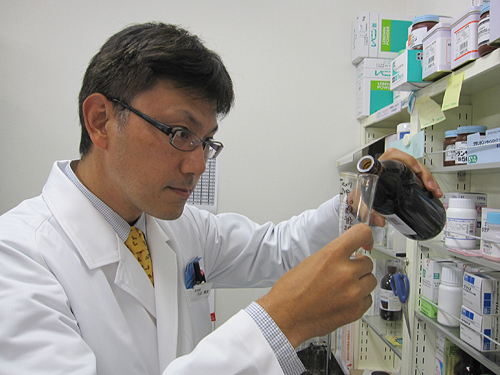 - わたしのお父さんはやくざいしです。まいにちたくさんのかんじゃさんのくすりをつくっています。このしゃしんは、お父さんがくすりの量をまちがえないようにしんけんな顔ではかっているところをとりました。こどもからおとなまで人それぞれくすりの量がちがうのでとてもたいへんそうでした。くすりをつくっているお父さんを近くでみたのははじめてで、がんばっているんだなぁと思いました。