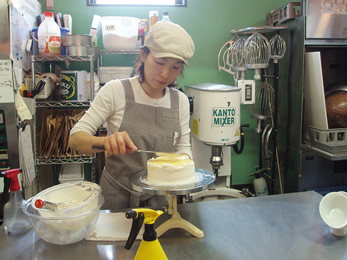 - ケーキを作る作業場では、ショーケースにならべられたきれいなケーキを笑顔で販売されている姿とは全くちがい、機械と道具に囲まれて真剣な顔でケーキを作られていて圧倒されました。お客さんを笑顔にするには、このがんばりが必要なんだと思いました。働くってとても大変なんだと感じた一枚です。