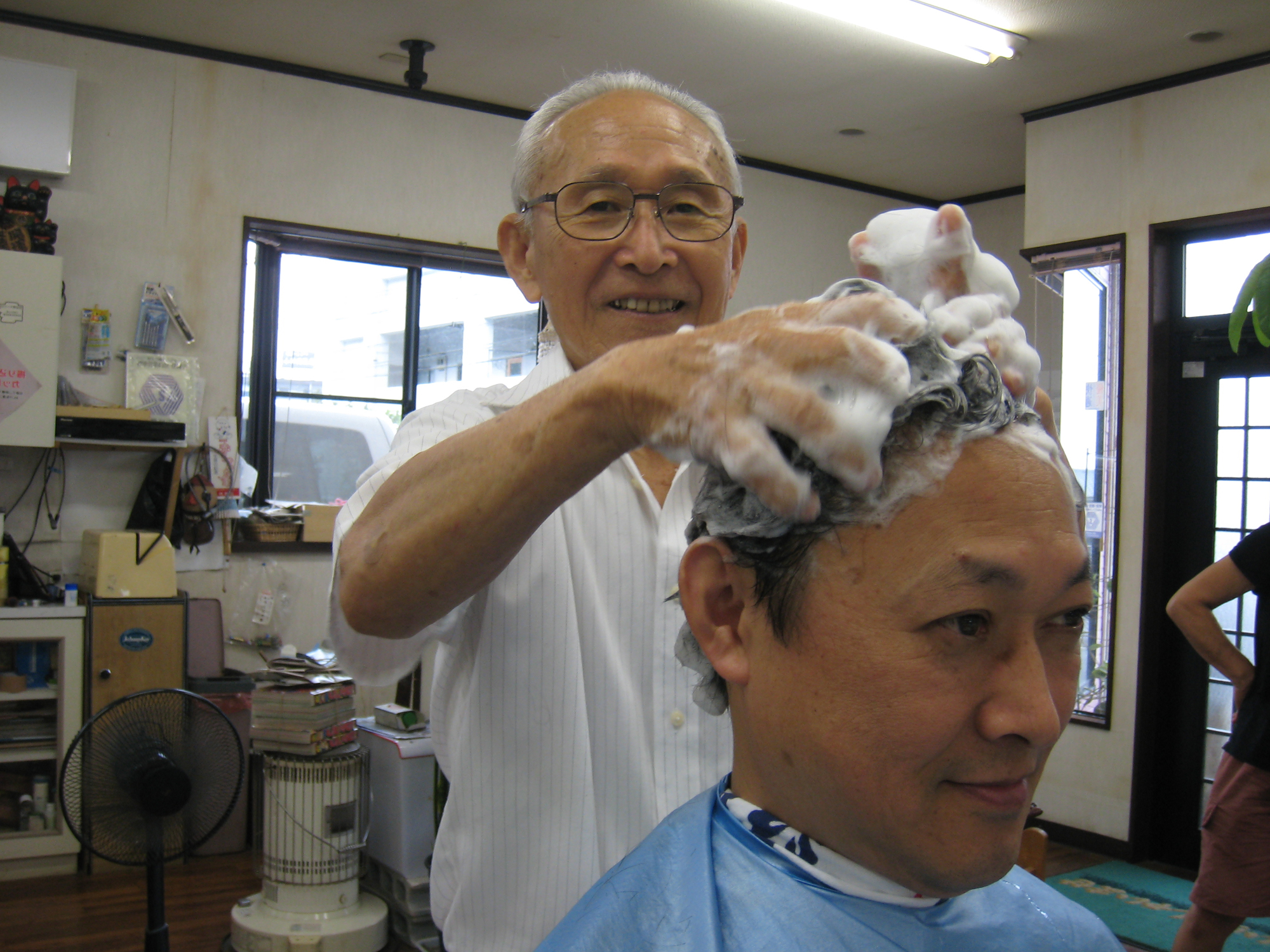 - 3年ぶりに、お父さんのふる里に行き、おじいちゃんがやっている理容室で、お父さんが髪を切ってシャンプーをしてもらいました。おじいちゃんは、久しぶりにお父さんのシャンプーをして楽しそうに見えました。お父さんは気持ちよさそうでした。二人の嬉しそうな表情を撮ることができてよかったです。