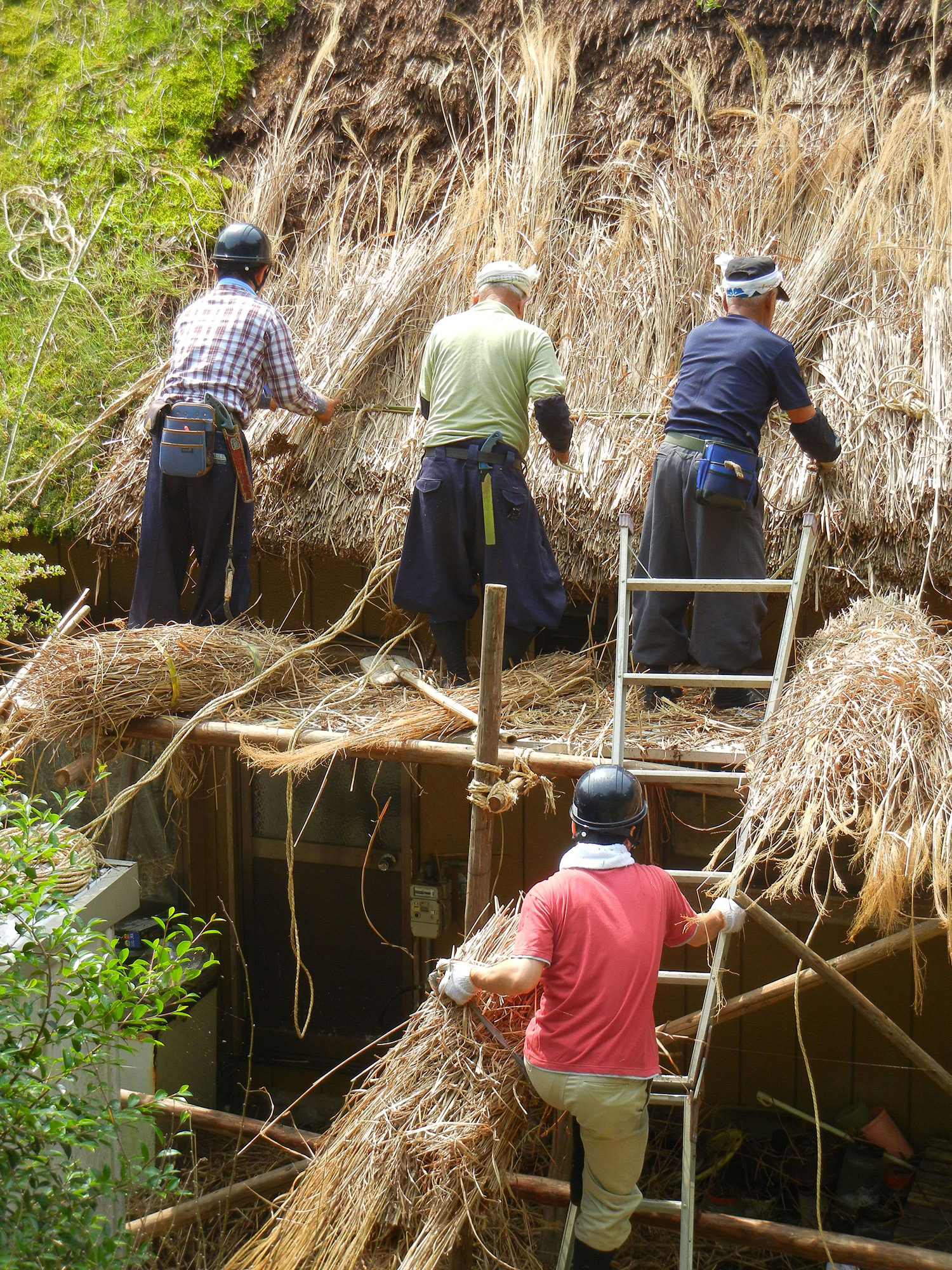 - この写真は,茨城県にある茅葺き民家で撮影した茅葺き職人さんの写真です。失われつつある日本の伝統文化を維持していく人に感銘を受け,もっとたくさんの人に知って欲しいと思い撮影しました。足場の上で作業している職人さん達にお弟子さんが新しい茅を運んでいる場面です。それぞれの作業は違っても直向に茅を葺く姿がいいと思いました。