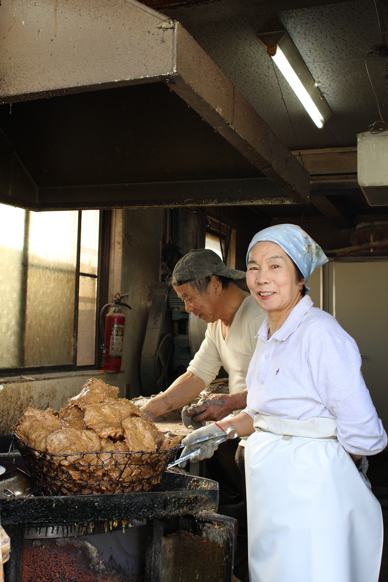 - 市内で働く、じゃこ天屋の夫婦を撮影しました。店を構えて以来、夫婦二人三脚でとても美味しいじゃこ天を毎日作り続けています。「一つ食べていかんかね?」と頂いた出来立てアツアツのじゃこ天は、お二人のぬくもりを感じました。長年使い続けて、油で汚れてしまった器具たちは、その店の伝統そのものだと思います。